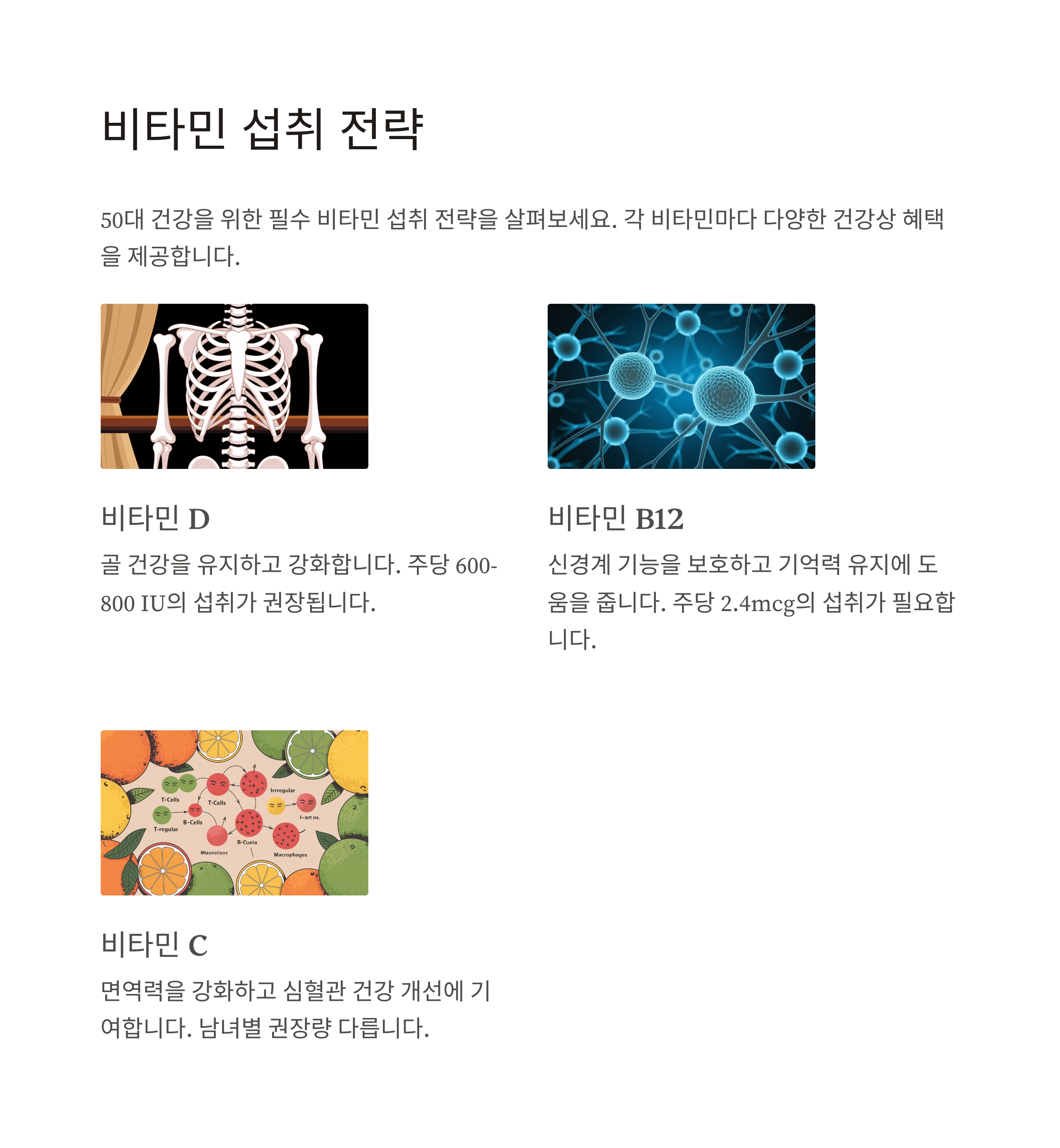 50대 이상의 건강을 위해서는 비타민 D, B12, C의 적절한 섭취가 매우 중요합니다. 이러한 비타민들은 골 건강, 신경 기능, 면역력 강화에 핵심적인 역할을 합니다. 특히 비타민 B12의 경우, 식품을 통한 섭취와 함께 보충제 사용을 고려해볼 만합니다.